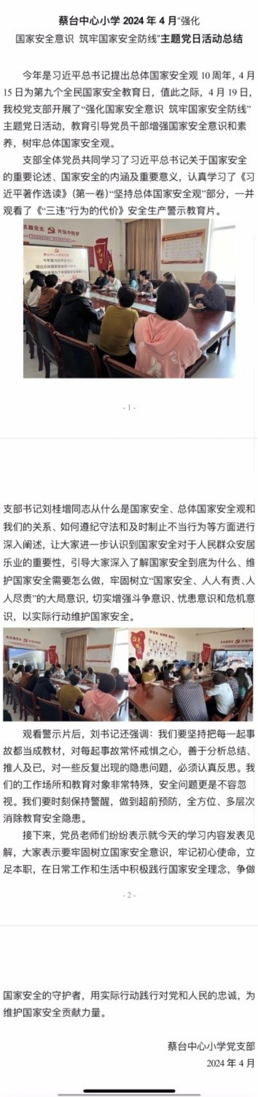 蔡台中心小学 2024 年 4 月“强化国家安全意识 筑牢国家安全防线”主题党日活动总结