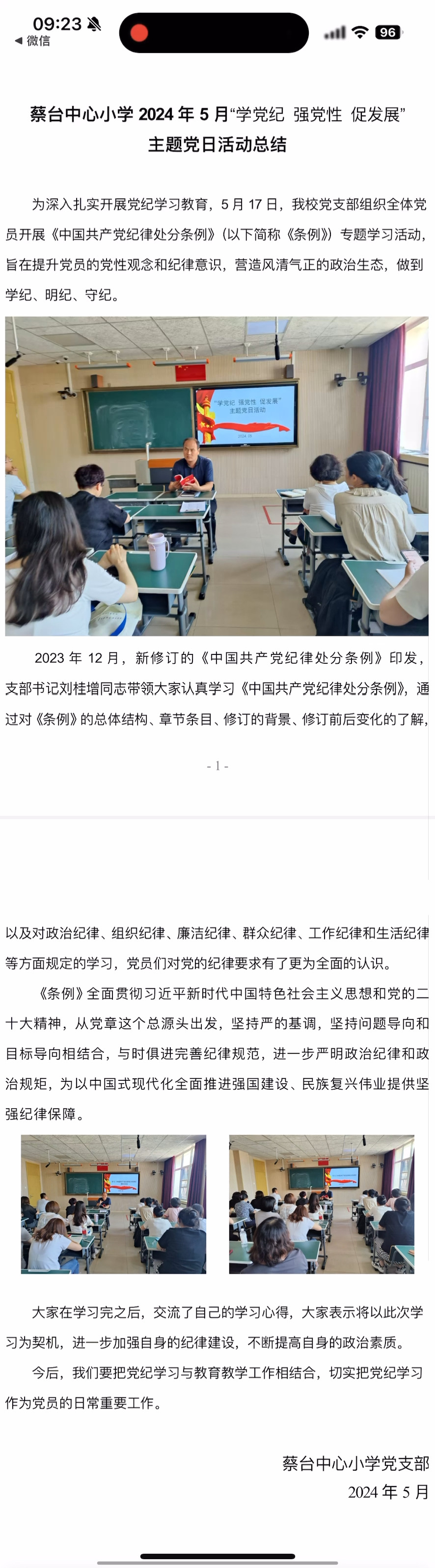 蔡台中心小学 2024 年 5 月“学党纪 强党性 促发展主题党日活动总结